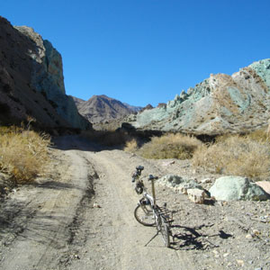 まず向かったのは<Siete Colores>。Uspallataの町からひたすら東方向へ進む。未舗装のアンデスの中へと入っていくのだが、この向かうまでの道がえらく心地よい。道はガタガタなので、自転車で走って気持ちのよい道ではないのだが、周囲の風景が抜群。で、そろそろ<Siete Colores>に辿り着くはず・・・それっぽい岩肌を見ることができるっちゃできるのだが、どこが、そのスポットなのか分からず。案内板が立っているわけでもないし・・・バイクで散策しに来ていたお兄さん達に聞いてみたのだが、彼らも、分からないとのこと。まぁ、アンデスっぽい風景を堪能できたし、いいかと引き返す。