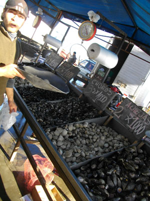 汐見荘から2kmほど離れた場所の桟橋にある魚市場、いやぁ、並んでます、いろんな貝やら魚が。しかし、魚貝オンチなオイラは、姿カタチを見ても、それがナンであるかまったく分からず。しかも、スペイン語での名前で書かれている名札を見ても、サッパリ。潮の香りが漂い、活気ある市場の雰囲気は楽しめるんだけど、何を買っていいのやら分からず、ウロウロするばかり。