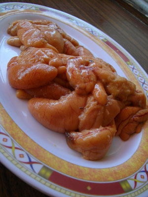 さて、宿に戻ってきて・・・魚料理第二弾<タラコ作り>を開始したのでした。これも作り方が情報ノートに書いてあって。見てたら作りたくなってきちゃったんですよ。意外と簡単に作れそうだし。作り方としては・・・買ってきたタラの卵をそのままお皿に並べ、大量の塩をふります。そのまま4時間放置。その後、ある程度塩を抜くために、薄い塩水にいれ、これまた4時間ほど放置。その後、取り出したタラの卵を皿に並べ、水気を切るため、皿を傾け、その状態で一晩寝かせれば完成ってワケなのです。