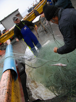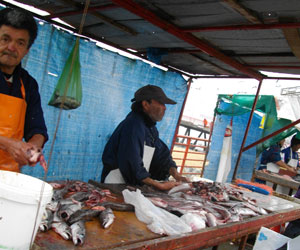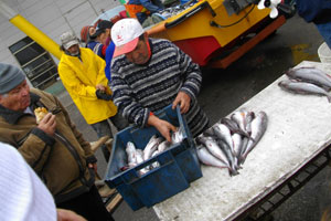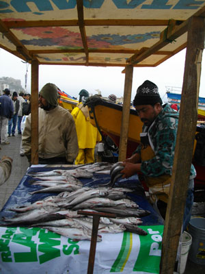 市場へ入ってみると、おととい以上に魚が並べられていた。そして、市場の脇には次々と船がつけられ、投網漁でとった魚が水揚げされていく。実は、前回魚市場を訪れた時、新鮮な驚きはあったものの、市場としての盛り上がりは微妙な感じでして。「ビーニャの魚市場ってこんなもんなのか・・・」って正直ちょっとガッカリしたところがあったんです。が、今日の魚市場は、オイラの思っていた以上の活気溢れる魚市場でして。前回ビデオを回すほどじゃなかったから、今日はビデオを持ってこなかったんですよねぇ・・・シマッタ、今日の盛り上がりは、ビデオに収めておきたかった・・・