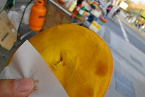 引き続き散歩してたら、Sopaillaの屋台を発見。ハルミさんに勧められてたSopailla、食べてみたいと思っていたものの、ビーニャでは遭遇しなかったんですよ。Sopaillaとは、カボチャで若干味付けした小麦粉を練って平たく延ばした生地を揚げた(たぶん無発酵)、おやつパンなのです。一つ100ペソくらいで食べられる庶民のおやつ。味は・・・ちょいとしょっぱい揚げパン。エンパナーダが600ペソくらいしますからね、ちょいと口寂しい時に食べるにはちょうどいいおやつって感じ。