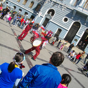 ビーニャから8kmほどの場所にあるバルパライソ、自転車だとあっという間に到着です。まずは、軍艦が停泊しているプラット埠頭へ。埠頭の前は賑わっていて、民族衣装らしき衣装を着た人たちが、生演奏にあわせて踊りを踊っていた。う~む、いいなぁ、ビーニャの街をウロウロするより全然楽しいじゃないですか、バルパライソ。で、そのままソトマヨール広場の方に行ってみると、ここにも、また人だかりが。ここでは、オルガンの音色に合わせて、体にまとえるように改造したドラムセットを踊りながらリズム伴奏をするという、大道芸が繰り広げられていた。打楽器マニアなオイラとしては、この手の大道芸は大好き。しばし、足を止め、鑑賞。
