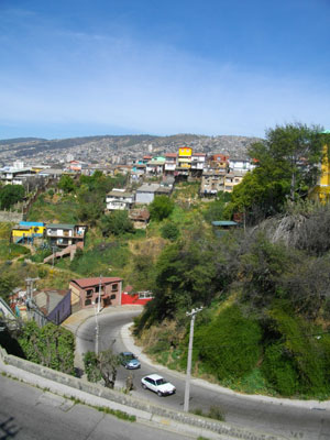今日はめずらしく朝の魚市場には行かず。溜まった使用済みシャツ&パンツを洗濯した後、自転車を持ち出し、おでかけ。本日向かったのは、ビーニャの隣にある町<バルパライソ>。街並みが世界遺産にも登録されていて、観光するならビーニャより雰囲気があってよい、とは聞いていたものの、毎日海鮮料理に明け暮れ、行きそびれていまして・・・そろそろビーニャも出発することだし、出発する前にバルパライソに行っておくか、と向かったのです。ええ、久々の観光デス、はい。