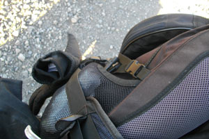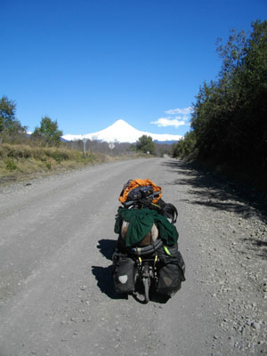 Curacautinの町を抜け、Llaima山へと向かう。途中、舗装されていた道は、次第に未舗装の砂利道へと変わっていく。ガタガタ揺れる自転車。途中一度だけビデオカメラを取り出し、風景撮影をした後は、ガタガタ道運転に集中し、ひたすら自転車走り。16時も過ぎ、ちょいと小腹が空いたので、パンをかじることに。ここで、おやつタイムをビデオに撮ろうと思って、ビデオカメラを入れておいたフロントバックのサイドポケットを見ると・・・あるはずのビデオが・・・無い!!!!