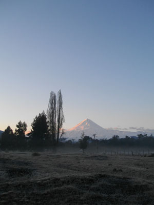一晩あけたものの、昨日ビデオカメラを落としたショックからは立ち直れず。朝日に照らされる絶景のトンガリ山(Llaima山)を見ても、心が湧かない。霜がはって、パリパリに凍り付いちゃっているテントと同じくらい、心が寒い。