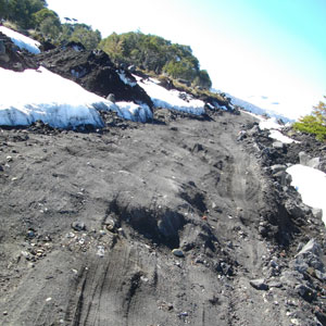 帰りは下り道となるため、比較的自転車に乗っていられる。ただ、砂道に突入するすると、タイヤをとられ、ひっくりこけそうになるので、降りて、押す。そんなことを繰り返していたら、前から一台の車がやってきた。すれ違う時に<キュッ>と止まった車の運転席のおじさんが声をかけてきた「どこから来たんだ?」「日本です」「いや、そうじゃなくて、今は?」「あぁ、この山を越えようと思って進んだんだけど、雪で進めなくて戻ってきたんです」とりあえずLlaima山を間近で見ようとやってきたおじさんたち、オイラの話を聞いて、この先に進むのは止め、ここで引き返すことにしたようでした。と、Uターンして戻ってきた車が再びオイラの隣で止まる。「乗っていくか?」ええ、ここはお言葉に甘えさせていただきます。半分心が折れかけているところでしたので、ホントありがたいお誘いです。