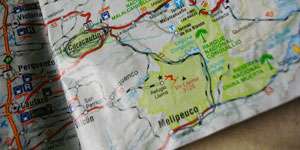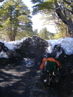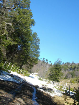 おじさんの車の荷台に自転車ごと乗せてもらい、来た道をひた戻る。本日テントを張った場所近くでおろしてもらうことに。ここには分岐道があり、地図上では、Llaima山の西側を通ってMellpeucoに抜けられる道があるのだ。おじさんたちは、このままCuracautinまで戻るよう。先ほどの雪による前進断念があっただけに、こちらのルートも同じように進めないのではないかと、心配し、オジさんたちに「こっちの道は大丈夫ですよね?」と聞いたところ「上り坂はきついけど、雪は大丈夫じゃないかな」と。オジさんたちを信じて、進むことにしたのでした。