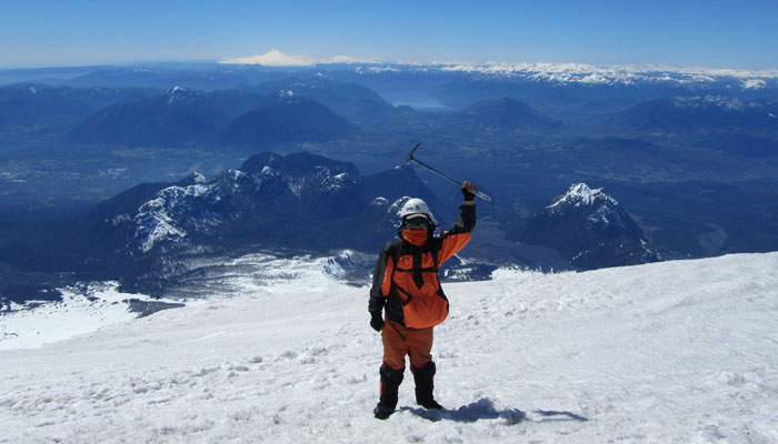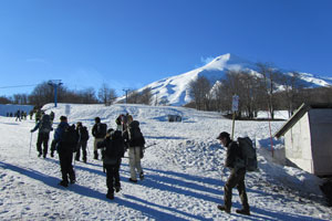 ここから、バンに乗ってビジャリカ火山へ。登山ベースとなる1440mの場所までは、車であがっちゃいます。で、車を降りると、一面雪の世界。ここ、スキー場になっているようで、スキー、スノボー客がたくさんいる。皆さんリフトで上る中、オイラ達はゲレンデ横を登り始めたのであった。