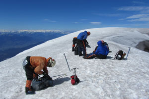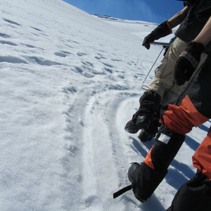 とにかく寒い山頂。山頂ではノンビリとクレーターやら、周囲の風景を楽しむ・・・なんて気分にはなれず。サクサクっと記念撮影をしたら、すぐに下山準備。準備・・・そう、下山のための特別アイテムがあるのですよ。それは、ガイドが<パンタロン>と呼んでいた尻当て。腰とモモのところで固定するようになっている尻当て、コレを履いて・・・滑り降りるんですよ、雪山を。そうです、尻スキーです。