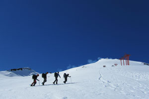 登山途中は、和気藹々と軽くオシャベリでもしながら登るのかと思いきや・・・皆黙々と登るんですよ。というのも、雪山登山、意外と大変でして。一応前の人たちが踏み固めてくれた道らしき場所を歩いていくのですが、足場はそんなに安定していない。しかも、天気がいいため、若干雪が解けぎみで、滑りやすくなっている。