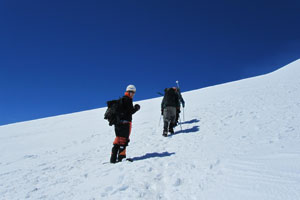 ガイドが先頭になって、基本的に一列で、スイッチバック的に蛇行しながら登っていくのですが、参加者の皆さん、それぞれ体力差がありまして。ガンガン登る先頭集団と、次第に離されていく二次、三次集団ができてくるのですよ。そして、意外とキツイ雪山登山、途中でリタイアする人たちも出てくるワケで・・・ガイドが2人つくのは、一人が先導役で、もう一人は、リタイアメンバーのサポートのためだったみたい。後方ではリタイヤ組の面倒をみるガイドの姿が・・・ちなみに、今回のツアーメンバー、9人中、男5人に女4人だったのですが、最終的に山頂まで登れたのは男4人に女1人の5人だけでした。