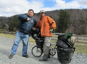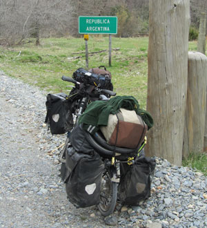 チリのイミグレは、問題なくパス。自転車に乗り、いざ国境越えと走ろうとしたところ、先ほどオイラのパスポートにスタンプを押してくれたイミグレのオジさんが、休憩がてら、外へ出てきた。そして「お、シクリスタだったか」と声をかけてきた。そして、オイラのファニーバニーを見て「いろんなシクリスタ達を見てきたが、お前の自転車はいいな、気に入ったぞ」と言ってくれまして。そんなイミグレのオジさんと記念写真をパチリ。