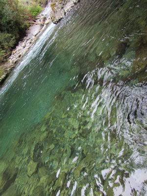 途中、ミラドールという看板があったので、そちらに出てみると、Las Gaviotasの村を手前にして、ルパンコ湖を一望できる素晴らしい場所へ。いかにもお手製な感じの椅子が置いてあったので、そこへ座ってしばし、眺める。と、先ほどの温泉疲れが出たのか、猛烈に眠くなってきた。ベンチ状の椅子だったので、そのまま仰向けに横になったら・・・いつのまにか、寝てた。冷たい風に頬をなでられて起こされたオイラは、一眠りしたためか、気分もスッキリして、再びトレッキング。そして、ヘタすると迷子になり戻れなくなるかもしれない、という道なき道を通り、辿り着いたRio Verde。緑の川と名づけられたその川は、本当にキレイなコバルトグリーン色でした。これまた晴れていたら、ものすごい色だったろうに・・・つくづく、今日の天気がうらめしい。