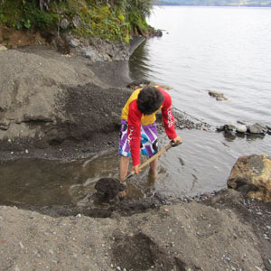ともかく、ボートは湖の上を快調に走り、温泉があるという湖の対岸へ。辿り着いたのは・・・うん?何もないただの湖畔です。温泉はこの奥にでもあるのかな?と思いきや、エランはボートからショベルを持ち出し、湖とつながって掘ってあった穴を掘り返しはじめた。「ここが温泉だ」と、エラン。えぇ~、こんな湖畔沿いの場所なの?っていうか、湖の水は冷たいんですけど・・・そこは温かいの?これは、ひょっとして、海外にありがちな、ぬるいお湯風呂ってやつなのか?と思って、エランが掘り返したところに溜まっている水を触ってみると・・・「熱ッ!!!」メッチャ熱いじゃないですか。このまま源泉には入れないくらい熱い。湖の冷たい水と混ぜ合わせてちょうどいい湯になるくらいの熱さでして。あぁ、道理で、と、湖とつながって掘り返されているん温泉の構造に納得。