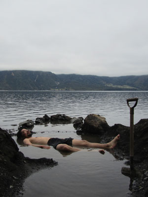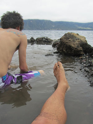 あらかじめ水着は着用してきておいたので、その場で衣服を脱ぎ、いざ温泉へ。エランも水着に着替え、一緒にお湯につかる。つかるといっても、湯船ほどでっかく穴を掘り返したワケではないので、横になって、ようやく半身浴できるって感じ。でも、それでも十分体は温まる。う~ん、いい湯だと、すっかりリラックスモードなのだが・・・このままじっとしていると、源泉の方から次第に熱い湯が攻めてきて、ヤケドしてしまうほどの熱さになるので、適当にかき混ぜてやらないといけない。いやぁ、それにしても、このナチュラルすぎる自然温泉、めっちゃイイ。湯はもちろん、ロケーションがいいし、なにより、自分達で作った温泉という感覚が、気分を高揚させる。あいにくの曇り空なのが残念。青空だったらどれだけ気持ちがいいか。ちなみに晴れていたら、湖の向こう側に、白いトンガリ山であるプンティアグド山の頂が見えるらしい。あぁ~その絶景を見ながら、この湯に浸かりたかったなぁ・・・