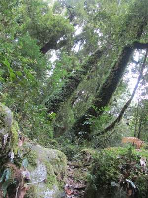 さて、Las Gaviotasに戻って「温泉、すごくよかった」とエディスおばちゃんに報告したところ、「この道をあがっていくと、キレイな川があるから、そこに行くといいわよ」と、次なるスポットを教えてくれた。早速、教えてもらった道をトレッキングすることに。教えてもらった道は、裏山につながる道になっており、こんもりとした森の中を抜ける森林道となっている。ビジャ・ラ・アンゴストゥーラに続く、森林トレッキングとなったワケですが・・・観光用に洗練されていたビジャ・ラ・アンゴストゥーラのトレッキングとは違い、今日の道は、道もどこにあるんだかよく分からないほど混沌としている。いや、今回の風景は、完全に<もののけ姫>の世界。どこからかダイダラボッチが出てくるのではないかとワクワクしながら歩く。