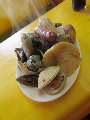 さて、8番の店<レストラン Eli>に入ってオーダーしたのは・・・<クラント>。プエルト・モンの名物料理です。貝と一緒にソーセージやら牛肉・鶏肉を煮込むというごった煮料理。一人前で食べきれないほど出てくるという噂のクラントは、確かに、ドーン、と大迫力。貝、肉のほかに、小麦粉を練った、日本で言うスイトンのようなものも一緒に入っている。で、味はというと・・・まぁ、シンプルなものでして。具材をみて想像する味、そのものです。貝と肉の味です、ハイ。そして、一応平らげたんですが、かなりお腹いっぱいに。これ、たぶん、オリジナルは漁師飯ですよね。力仕事の漁師さんが、パワーをつけるために食べる料理というのであれば、納得する味と量。あ~これ、チャリダー飯に通じるものを感じる。最近オイラがはまっているラーメンリゾットも、米とラーメンという炭水化物に、ありあわせの食材をぶち込んで煮るというものですから。いやぁ、ホント、とにかく腹を満たすということをメインの目的とした、パワー料理だ。自転車走りの次の日だから食べれたけど、これ、2,3日滞在した後だったら、食べ切れなかっただろうな・・・