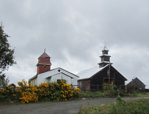 途中、チロエ島ならではの雰囲気ある教会を発見。チロエ島らしい風景になかなか出会えず、チェって思っていたオイラですが、この教会の屋根に1本尖塔がある独特の教会様式はチロエ島っぽくていい。ただ、雨がめんどくさくて。普段なら、もっと近寄って構図を考えて写真を撮るのだが、もう、自転車を止めたその場で、片手でスナップショット。ダメです、こんな撮り方をしていては、写真の腕が落ちてしまいます。めんどくさがらずに、いい場所に動いてシャッターを切れ・・・これが、オイラの写真術の基本なのに・・・