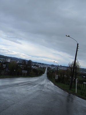 さて、とにかく雨の中をひた走り、チロエ島最大の街であるカストロに到着。もともとこの先20kmくらいのところにあるチョンチーという町に泊まる予定であったオイラ、カストロでは、ちょいと街をグルリと見てからチョンチーに向かおうと思っていたのですが、あいにくの雨で、そんな気分にもならず。カストロは完全にスルー。今思えば、カストロで泊まるという選択肢もあったんですけどね。走っているこの時は、もう意地になってました。どうせ濡れているし、走りきったるって。