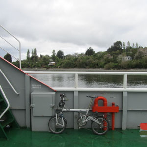 ナップザックにパン・バナナと水をつめ、ファニーバニーにまたがって出発。セントロから4kmほど海岸沿いに走ったところに、チロエ島とレムイ島を往復しているフェリー乗り場がある。オイラの到着とほぼ同時に、フェリーもやってきた。自転車ごと乗り込み、いざレムイ島へ。ここのフェリー、無料なんです。車からは料金を取っているみたいだけど・・・それにしても、フェリーで10分の距離を休むことなく往復運送しているフェリー。これだけ運ぶものがあるのなら、いっそのこと橋を通してしまったほうが経済的なのでは?とも思うのですが・・・やはりフェリー運営のほうか安上がりなのでしょうか?