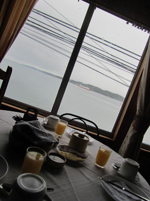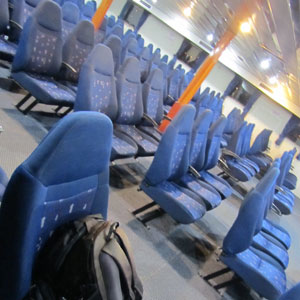 ファニーバニーは、船の荷物スペースに止めることになり、船の揺れで倒れないようにしっかり紐で固定してもらう。で、オイラはそのまま客室へ。広い客室にはほとんど客がいない。どうやら、客は7人くらいしかいないらしい。どこでも好きなところへと言われ、適当に座席を陣取る。どうせ、お客はいないので・・・3席ほど使い、横になって寝る体制に。フェリーではひょっとしたら、眠れないかも、と思っていたのだが、これはぐっすり眠れそうだ。