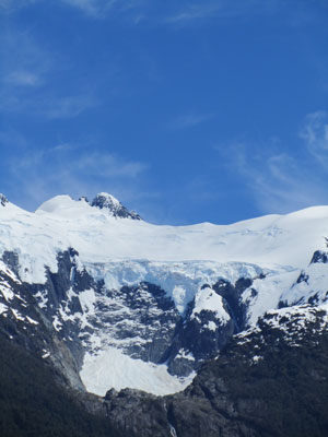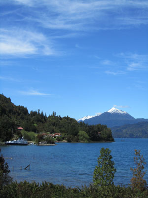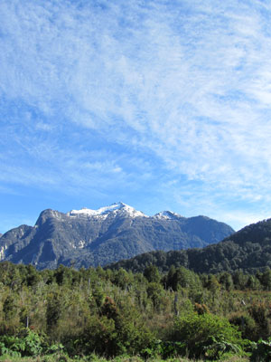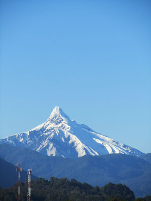 朝起きて、ドキドキしながら窓の外を見る・・・雨音は聞こえないから雨は降っていないようなのだが果たして・・・おぉ、快晴ではないですか!!!雲ひとつない青空。いいんですか?こんなに晴れちゃってっていうくらい晴れ渡っている。海岸へ出て左手を見ると、おそらくコルコバード火山(Vn. Corcovado)と思われる火山がクッキリ見えた。いやぁ、こいつもいい形をしてます。この時期、雪化粧したチリの火山はどれも素晴らしい。