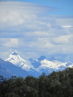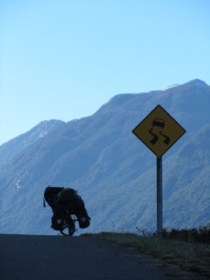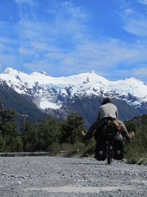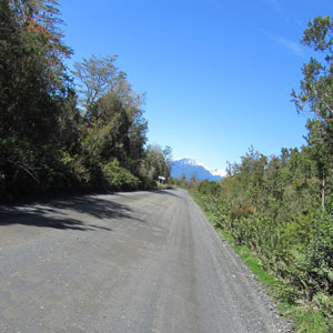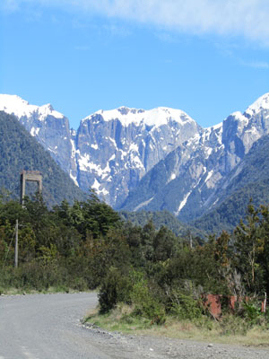 太陽の下で走る、アウストラル街道は、確かに風景が素晴らしく、気持ちいい。緑に囲まれた中アスファルトの道をグイグイ走っていくのは、相当テンションがあがる。が、25kmほど走ったところで、舗装道路は終了。未舗装道路に突入してしまった。テンションは微妙に下がりぎみ。チリで走りを再開させて以来、未舗装林道ばかり走ってまして。というか、ここんところ、未舗装林道ばかり走ってきたといっても過言ではない。正直言って、そんなにかわり映えはしないのですよ。このアウストラル街道、晴れれば世界一美しい林道と言われているのかもしれないですが、そこまで他の林道と違っている感じもしないし。いや、風景は抜群にいいですよ。遠くに白い雪帽子をかぶった山々がずっと連なっているのが見えるし、鮮やかな緑の中に、黄色や赤や紫の花が彩りを添えているし。う~ん、でも、期待しすぎちゃったのかなぁ。思っていたより心が湧き踊らない。