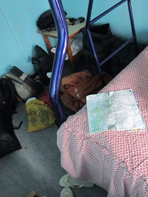 朝起きると、まだ雨音が聞こえる。窓の外を見ると、空には一面どんよりとした雨雲が漂っており、雨がシトシト降っている。気持ちは前に進みたいのだが、雨の中走らなきゃならないほど急いでもないし、できれば濡れない状況で走りたい。ということで、今日も出発せず。宿でまったりと過ごすことに。一応ドミ部屋なのだが、他に客がいないので、ほぼ個室状態なのをいいことに、二日も滞在すると、荷物を広げるだけ広げてしまい、大変な状態になっている。
