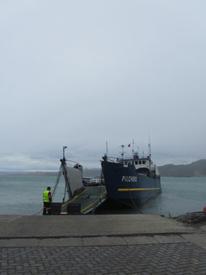 さて、今回、フェリーのチケットを持っていない。前回、コイアイケでしか買えないからといって買ってきたフェリーのチケット、今回はコイアイケに行っていないため、購入しないまま、プエルト・イバーニェスに来てしまったのだ。まぁ、発着場でチケットが買えないわけもなく、プエルト・イバーニェスにも、フェリー会社マール・デル・スーのオフィスがあった。チレチコまでのチケットを買おうと思い、オフィスへ行くと、「自転車も一緒か?」と聞かれた。「ハイ」と答えると、「10時に、コイアイケのオフィスに確認して、状況を確認してからじゃないと、チケットを売れない」ときた。ん~、どうやら、一応プエルト・イバーニェスでもチケットを買うことができるらしいのだが、基本的な乗船状況確認は、コイアイケのオフィスでやっているらしい。しかも、その辺の情報はオンラインで管理されているワケではないらしく、イチイチ電話で確認するようなのだ。搭載容量を見極めなきゃいけない、車ならまだしも、甲板の端に置かせてもらう自転車なら、確認しなくても大丈夫じゃない?とは思いつつ、10時まで待つ。10時にオフィスのオバちゃんが、コイアイケに電話をしてくれ、OKという返事をもらって、ようやくチケットをゲット。