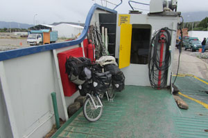 そのままフェリー乗り場へ向かう。到着したフェリーの甲板に自転車をそのまま停める。前回はそのままだったのだが、今回、風が強く、大きな揺れが予想されるということで、自転車が倒れないように、紐できっちり縛り付けてくれた。