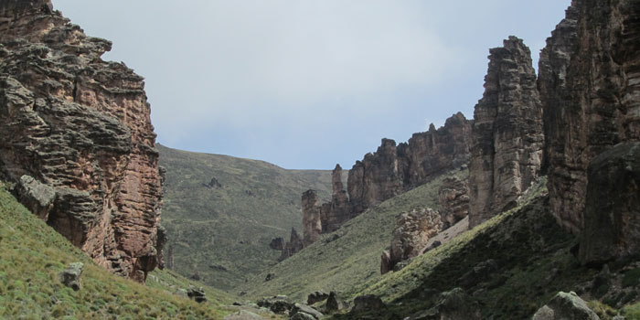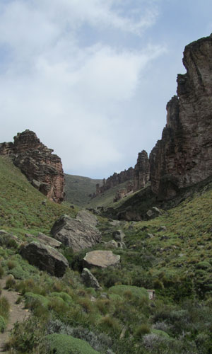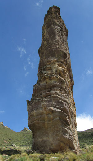 さて、ここからは歩きでのトレッキング。宿のオバちゃんが、トレッキングルートが分かりづらいよ、と言っていたのを聞いて、ゲンナリしていたのだが、意外と分かりやすい道が続いていた。しばらくトレッキングルートに沿って歩いていると、見えてきました、奇岩たちが!最初に見えてきた、奇岩で囲まれた谷は、<Alero de Pinturo Rupesite>と名づけられた場所。この谷の中を通っていくのだが、両脇から覆うように圧迫感をかけてくる岩岩の迫力がスゴイ。ここもまた、奇岩フェチのフェチ心を満足させてくれるには十分すぎるほどの素敵な場所でした。そして、この谷を抜けると見えてくるのが、<Piedra Clavada>というまるで木のように一本にょっきり生えている縦長の岩。なんと縦の長さが40mもあるというこのノッポの岩は、近くに行って見ると、なんだか心打たれるものが。これ、写真で見たときには、そんなに見たいって思わなかったんですけど・・・実際行って見て、今日一番感動したモニュメントでした。実物が持つパワーがあふれ出ていたというか、なんか地球パワーを感じたスポットでして。パワーとともに安らぎを感じた、この<Piedra Clavada>の下で弁当を食べ、パワー充電。