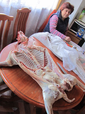 そんな書き残している日記が気になり、ちょっと前の日記を書き始めたものの・・・晴れた空の誘惑には勝てず、今日も外をプラプラと散歩。で、散歩から戻ってくると、宿の台所のテーブルにドーンと、解体されたコルデーロ(子羊)が!「今日の晩飯は子羊の丸焼きなのよ」とおばちゃん。「今日は何かの記念日なんですか?」と聞くと「いや。そういう気分なのよ。これは普通に食べるパタゴニアの伝統料理。今日来るお客さんに出すの」とおばちゃんが言う。この宿では、もっぱら自炊で、料理は頼んでいないオイラ。コルデーロを目の前にして、食べたそうな気持ちが顔に出たのか・・・「もし、残ったら食べさせてあげるわ」と、そんなオイラの顔を見て、おばちゃんが誘いの言葉をかけてくれた。「たぶん残ると思うんで・・・その代わりといってはなんだけど、ちょっと手伝って」とおばちゃんはオイラに、この解体されたコルデーロを奥の部屋にもっていくように指示。食べさせていただけるのなら、喜んで!!!と、後ろ足をつかんで持ち上げるオイラ。皮を剥ぎ取られた頭から、生々しく血が滴り落ちる。ざっと20kgはあるであろうこのコルデーロ、結構重い。奥の部屋の壁に打ち付けられた釘に、かけてと、おばちゃんに言われ、かけたところ、釘がポキリと折れた。「あらあら、もっと強い釘じゃないとダメかしら」と部屋の奥から太い釘とハンマーを持ってきて、壁に打ち付けるおばちゃん。打ち付け終わった釘にコルデーロをひっかける。