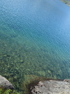 と、しばらく進むと、目の前に湖が見えてきた。湖は、見飽きた感もあるので、そのまま素通りしようかと思いつつ、チラリと湖の方をみると、これが、素晴らしい湖じゃないですか。空は青空で、太陽がテカテカ輝く最高の湖日和だったというのもあるのですが、素敵に輝く<エスメラルダ湖>に魅せられてしまい、思わず、自転車を止めて湖岸に立ち寄るオイラ。どうやら、そんな想いをするのはオイラだけではなかったようで、ちょっと離れた湖岸には、二人組みの旅行者の姿が見える。つーか、道沿いには、自転車も車も止めてなかったんですけど・・・彼らは歩きで来たのだろうか?コクランからは結構離れてますよ、ココ。