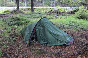 朝、雨音で目覚める。結局、一晩中降り続いた雨。幸い、大雨ではなく、かつ、林の木々が雨よけの役割を果たしてくれていたというのもあり、雨漏りで、テント内はびしょぬれという事態は避けることができた。雨中走りは嫌だなぁと思いながら、出発準備をしていると、次第に雨が止み、青空が覗くようになった。おほほ、威力を発揮、晴れ男オイラのサンパワー。