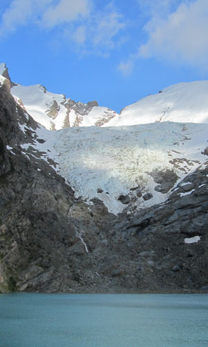すっかり違和感がなくなってきたテントで迎える朝。起きて外に出ると、昨日の天気がウソのように空は晴れ渡っている。これは、朝飯前に、散歩がてらに氷河でも見てくるか、とキャンプ場の裏山へと向かうオイラ。そう、このキャンプサイト、場所代として30ペソ要求されるのだが、裏にでっかいウェムル氷河があり、ここに泊まれば勝手に見に行くことができるのだ。ちなみに、ここはキャンプ場オーナー所有のプライベートな土地。自分の土地に氷河があるって・・・なんて素敵な土地をお持ちなんでしょう。