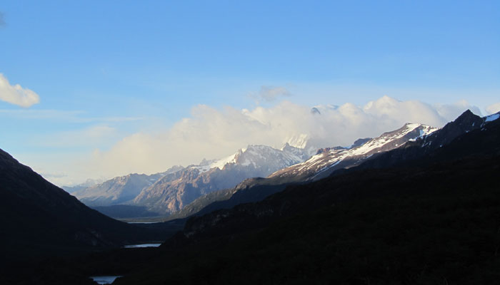 ちょいとしたトレッキングルートになっている山道を30分ほど上り、辿り着いたミラドール。目の前に見えた氷河に感動・・・というより、ここから見えるエル・チャルテン方面の景色の絶景っぷりに目を奪われてしまった。あいにく、フィッツロイと思われる山には、雲がかかってしまっていて、その姿の全貌を拝むことができない。時々雲の切れ間から見える姿にドキドキさせられる、チラリズム。風が吹いているのか、雲はえらい勢いで流れている。この雲の流れだったら、そのうち雲がかかっていない姿を見れるんではないかと、寒い中しばらく待ってみたものの、次から次へと発生する雲が切れ間なくフィッツロイにかかるため、見れない。お腹も減ってきたため、諦め、テントのある場所へ戻る。