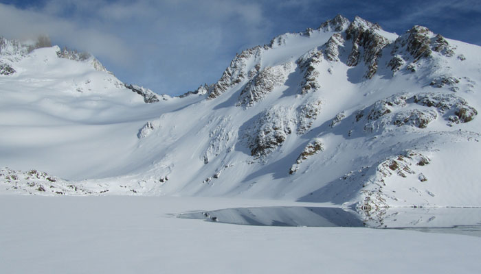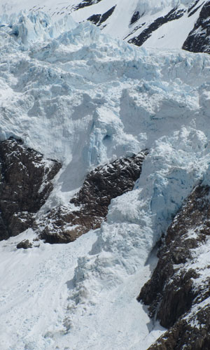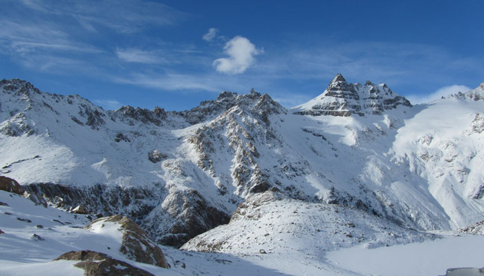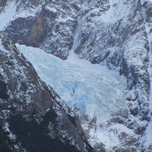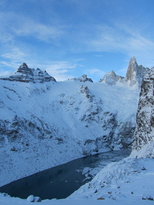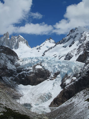 キャンプ場まで戻り、早速朝食にパスタを作り、平らげる。テント生活はこれで終わりなので、残りのパスタ&ソースを使い切った大盛りパスタ。お腹が膨れたところで一休み。休んでいる間に、朝早くからトレッキングを開始してきたと思われるトレッカーたちが、キャンプ場へと辿り着きはじめた。皆がテントを張り始める中、オイラはテントをたたみ、エル・チャルテンの町に戻るべく出発。と、歩き始めたのだが、来る時は乾いていたトレッキングルートが、ぬかるんでいる。積もった雪が日の光を浴びて溶け始め、さらに、歩いてきたトレッカーたちに踏まれることで、道がドロドロになってきているのだ。そんな足場の悪い中、しばらく歩いた後、今日のフィッツロイに別れの挨拶をすべく振り返ってみると、フィッツロイの姿とともに、初日に見に行った<Piedras Blancas Glaciar>の姿が目に入った。そうだ・・・ピエドラス・ブランカス氷河は、晴れたらもう一度見に行こうと思っていたんだった・・・もう、しばらく歩いちゃったことだし、氷河は諦めて、そのままエル・チャルテンに戻ろうと思ったのだが、新たに雪化粧されたピエドラス・ブランカス氷河は、3日前に見た時より、心なしか迫力あるように見える。これは、このまま無視して帰るワケにはいかない。せっかくフィッツロイで満足したんだから、やり残しはないように、完全燃焼して帰ろうと、氷河を見るために、引き返し始めるオイラ。そして、再び舞い戻ってきたポイセノットキャンプ場前。3日前は、リオ・ブランコを渡って、川沿いの岩場ゴツゴツ道を歩いていったのだが、この道は雪で危険度が増していると思われる。そこで、川を渡らず、対岸の山の上から氷河を眺めることができるという、もう一つのルートを辿って、ピエドラス・ブランカス氷河を見に行くことにした。40分ほどで、ミラドールに到着。ここから見えたピエドラス・ブランカス氷河は、やはり素晴らしかった。これでもう完全燃焼。やりきった満足感で心を満たし、帰りの途につくオイラだったのでした。
