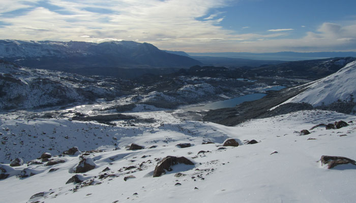 持ってきていたヘッドバンド式の懐中電灯を頭に装着し、目の前の道を照らしながら歩く。道中途中にあるリオ・ブランコキャンプ地までは、トレッキング初日に下調べがてら訪れていたため、暗闇の中でも、進むべき道順は分かり、順調に辿り着いた。が、ここからが、難関であった。まったく知らないトレッキングルート、そして、通常でも分かりにくいルートが、昨日一日降り続いた雪により、真っ白にコーティングされ、どこが道だか、サッパリ分からなくなっている。うむむ、困った。ここに来て、またパタゴニアトレッキングルートに負けるのか・・・?いや、それでは、なんのために2日間も、退屈なテント生活を送ってきたのかわからないではないか。ここは負けるわけにはいかない、と執念で道を探し始めるオイラ。雪に埋もれて分かりづらくなっているルートではあるのだが、適当な間隔で、上部が黄色く塗られた木の棒が、<ここがトレッキングルートです>と示す目印として立てられている。雪の上からチョコンと顔を出しているこの黄色の木の棒を探しながら、勘を頼りに、前へと進む。この勘、何度も挑んできたパタゴニアトレッキングの経験により、非常にいい感じで研ぎ澄まされている。途中、何度か道をロストしながらも、勘が教える方向に進み、なんとか黄色い棒と再会するということが続く。