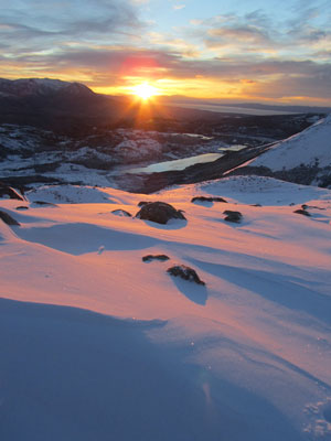 そうこうしているうちに、周囲が薄明かりを帯びてきて、懐中電灯の光なしでも足元が見えるようになってきた。振り返って東の空を見てみると、赤色に染まり始めている。いかん、これはちょっと急がないと、日の出までにロストレス湖には間に合わなくなっちゃうかも、という焦りが生じ始めた。ちょっと急ぎ気味に山を上ろうと思うが、雪に足をとられ、思うように先に進めない。周囲の山の輪郭が完全に分かるようになってきて、目の前に、フィッツロイの姿が現れた。いつのまにやら、山を上りきり、湖近くへと辿り着いていたらしい。いや、よかった。ここまで来れたら、後は適当に進んでも湖畔へと辿り着ける。夜明けももうちょっと時間がかかりそうだ。ホッとした気持ちで、前に進む。そして、ロストレス湖が見えてきた。湖ごしにフィッツロイが見える。確かにすばらしい風景だ。さて、どこから朝焼けのフィッツロイを拝むべきかと、ポイント探しをはじめる。ロストレス湖を越え、隣にあるスシア湖まで足をのばしてみる。ウロウロした結果、ロストレス湖畔の小高い丘の上からの姿が一番バランスよくフィッツロイを見ることができるということで、ここに陣取ることに決定。日が上るのを待つ。周囲はどんどん明るくなるのだが・・・なかなか日は出てこない。そうなんだよなぁ、日の出って明るくなってからが焦らされるんですよぉ・・・歩き回っている時は、体が火照っているためか、寒さをあまり感じなかったのだが、日の出待ちで、動きを止めてから、体が強烈な寒さを感じるようになってきた。ガチガチガチ・・・さ、寒い・・・ムリにでも体を動かして、体を温めようと、周囲を意味もなくウロウロ動き回る。