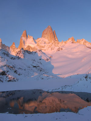 東の空の地平線には雲があった。雲の切れ間から真っ赤な陽が見える。おそらく日は地平線より上に出てきているはず。この真っ赤な陽が当たれば、フィッツロイが真っ赤に染まるのでは・・・西の空は雲ひとつなく晴れ渡っているというのに、肝心の太陽の光が届かない。このまま日の光がオレンジ色に変わってから山に日が当たることになってしまうのか・・・と思った瞬間、フィッツロイが赤く染まり始めた。エル・チャルテンの宿の壁に貼ってあった写真で見た、見事な深紅とはいいがたいが、朝焼けに燃える、素敵なフィッツロイ・・・写真を撮りまくるオイラ。一度光が当たり始めたら、あっという間に山全体が光に包まれていった。