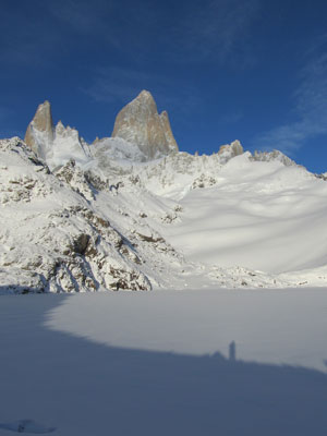 朝焼けのフィッツロイも素晴らしかったのですが、目の前に広がる、無垢な純白空間は、それ以上。それまでここに訪れた人の痕跡をすべて雪によって消し去ってしまった非人間的なこの空間は、この世の場所とは思えない、神々しさで包まれている。これか、この世界へオイラを連れてくるために、フィッツロイに住む神様は昨日一日雪を降らせていたのか。