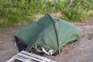 そう、今日は朝からものすごい爆風が吹き荒れているのですよ。廃車脇から流れ込む風だけでもスゴイ威力で、テントがバタバタと捲り上げられている。そして、気付いたら、風上側のペグが吹き飛ばされているではないですか。昨日、相当しっかり打ち込んでおいたというのに。風除けがなかったらテントごと吹き飛ばされてもおかしくない状態だ、これは。