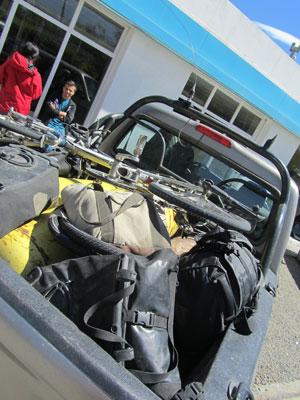 もう、考える間もなく、このご好意に甘えることにしました。ガス配達中らしいオジさんの車の荷台には、黄色いガス管がゴロゴロと乗っていたのですが、そのガス管の脇に、荷物や自転車を乗させてもらい、オイラは、助手席へ乗り込む。