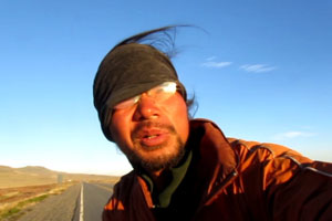 が、今日の風。こいつが<ザッツ・パタゴニアの風>でした。今までの強風は、パタゴニアの風なんかではない。この暴力的な爆風こそが、パタゴニアの風だったのです。いや、ホントに、ちょっと力を抜くと、紙相撲の力士のように自転車ごと押し倒されてしまう。あの表現は、大げさでもなんでもない、事実。相当重い荷物を積んで、ヘビー級のファニーバニーさえ、油断していると、前輪が浮き上がってくるのだ。どは~、これはとんでもない。力を抜かないように、自転車を支えつつ、一歩一歩前進する。横風を耐えるのは大変で、とてつもない暴風が迫ってきた時には、なるべく風を正面から受けるように体勢を入れ替える。そんな感じで、倒れないよう倒れないよう、自転車に神経を集中しながら、進んでいく。と、また横から爆風が吹きこんできた。反射的に、自転車ごと風方向に切り替えようとしたのだが、足がフロントバッグに当たって、一瞬動きが遅れた。その瞬間、眼鏡が吹っ飛んだ。いや、何かにぶつかったワケではない。暴風によって横っ面を殴られたような感じになり、眼鏡が吹っ飛んでいったのだ。そして、眼鏡はそのまま風に流され、反対車線の路肩の奥に広がるパンパへと飛ばされていく。「あぁ~、メガネメガネ・・・」すぐにでも追っかけて行きたいところだが、自転車を立てておいておくわけにもいかない。この爆風の中、スタンドで立たせても、倒されてしまうのは明らか。ヘタすると、スタンドを折ってしまいかねない。しょうがないので、自転車を横倒しにして、風に連れ去られてしまったメガネを追ってパンパへ突入。幸いメガネは、背の低い木に引っかかって止まっていてくれた。なんてこったい・・・メガネバンドなんてものは持っていない。でもこのままでは、また風にもっていかれるだろう。しょうがないので、ヘアバンドをメガネにかぶるように深くかぶり、ヘアバンドによって、メガネを頭に密着固定させて、飛ばないようにした。