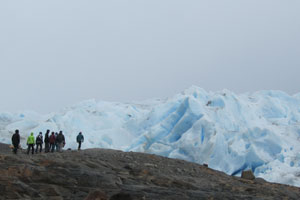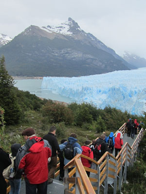 9時過ぎにペリト・モレノ氷河の展望台に到着。10時まで自由時間ということで、展望台からペリト・モレノ氷河を眺める。うむむ、確かに美しい氷河だ。白(青白)だけで構成されており、土による汚れがほとんどない。あぁ、日の光が当たっていたらもっときれいに見えるんだろうに・・・天気が悪いのがちと残念。オイラ的には、快晴の空の下でみたオヒギンス氷河のほうが、ポイント高い。