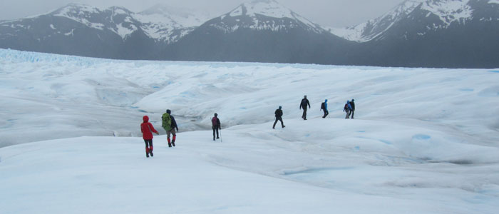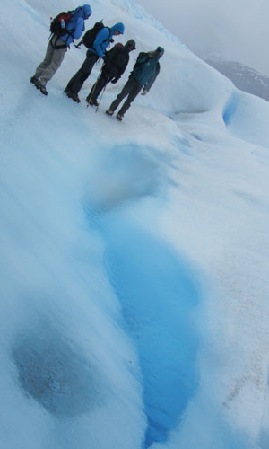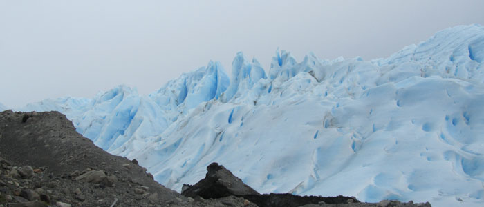そんな期待を大きく抱いていたペリト・モレノ氷河であったのだが、パタゴニアを南下するにあたって、数々の氷河を目にしてきたオイラ。ここカラファテに到着してみると、ただ氷河を見る、ということだけでは、そんなに興味を惹かれなくなっていたのであった。ん~、氷河を見に行くためだけに100ペソも払うのはなぁ・・・そう、ペリト・モレノ氷河が見れる展望台まで行く交通費が100ペソ近くかかってしまうのだ。自転車で行けばただじゃないか、と言われるでしょうが、80kmの距離はちょいとシンドイ。まぁ、普段だったら、一日かけて自転車で行って、向こうでキャンプして帰ってくるということをプランニングしたかもしれないが、先日のパタゴニア暴風を体験したオイラとしては、この辺を、あまり自転車で動き回りたくない。ん~、どうしようかなぁと思っていたところに、<アイストレッキング>の情報が入ってきた。ペリト・モレノ氷河の上を歩けるというアイストレッキング。これはただ氷河を見るだけじゃないぞ、ということで、一気にテンションが上がりまして。ちょいと高めで720ペソもするのですが、昨日、そのアイストレッキングツアーに申し込んできたのでした。