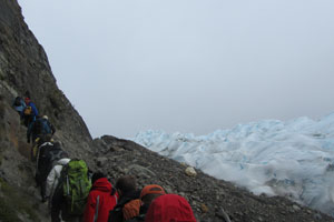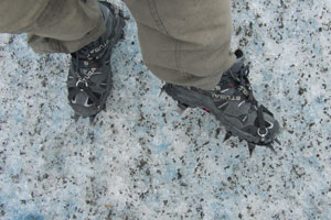 まずは近くにある山小屋へ。ここでトイレをすませ、氷河の脇の岩場をトレッキング。1時間ほど横目で氷河を見ながら歩くと、林の中にテントが張ってある氷河トレッキング入り口ポイントへと到着。ここで、ハーネスとアイゼンを渡され、装着。アイゼンとは、靴にはめ込むアダプタ。鉄製で、とんがった歯がついており、この歯を氷にかませることで、滑らずに氷上を歩くことができるようになるのだ。ツアー客全員がアイゼンをつけ終わったことを確認して、いよいよ、アイストレッキング開始。さぁ、テンションあげて・・・と言いたいところなのだが、天気がビミョー。相変わらず、空は雲で覆われ、パラパラと小雨が舞っている。そして、何より、かなりの横風が吹いているのがウザイ。パタゴニアの爆風を体験したオイラとしては、このくらいの風は大したことないのだが、それでも結構な風が吹いているわけで。写真を撮ろうと、レンズを開くと、風で吹かれた、雨の水滴がレンズにつくのが、ホントにウザイ。