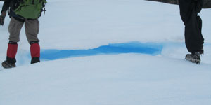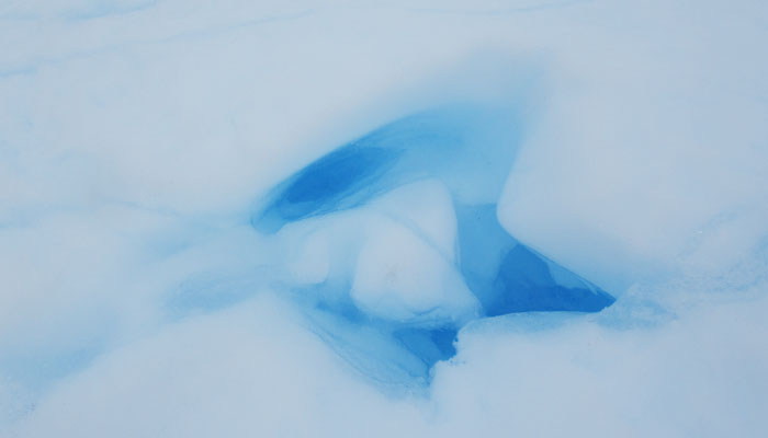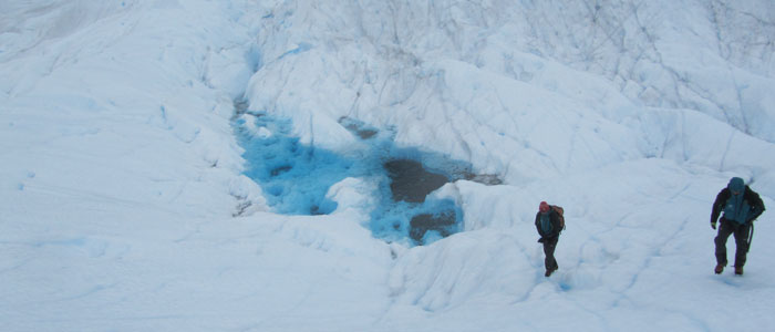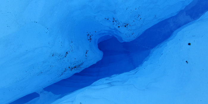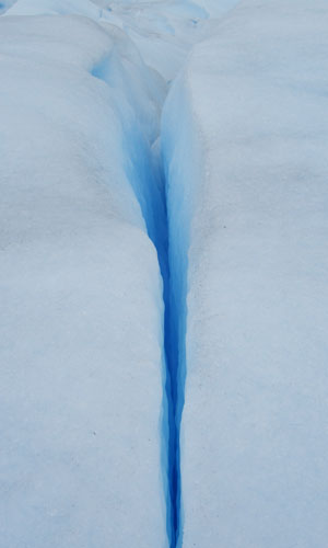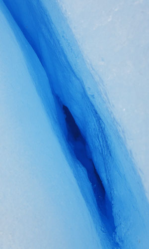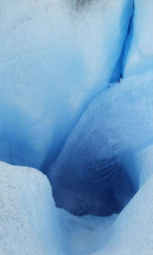 中は氷の滝になっており、川の水が、注ぎ落ちている。水が注ぎこむ先は、深遠なる蒼色の世界。覗き込んでいると、思わずその世界へ足を踏み込ませたくなる誘惑に駆られてしまう。思わず一歩踏み込んでしまったところ、後ろから、ギュッと引きとめられた。ガイドがオイラの背負っているナップザックをつかんで、引き戻してくれた。「それ以上行くと、クレバスに落ちてしまうぞ」とガイド。いやいや、危なかった。一人で来ていたら、あの世界へ、引き込まれていたぞ。
