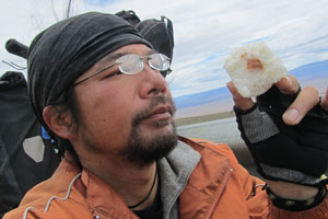 オジちゃんたちが去った後、ちょうど時間がお昼過ぎということもあり、ここで昼食にすることに。とりだしたるは、おむすび。最近、キッチンが使える宿から出発するその日はお弁当のおむすびを持参している。で、そのおむすび、いつもは、具なしの塩ニギリなのだが、今日はスペシャルバージョン。なんと、梅干入りなのだ。藤旅館の奥さんに、「余ったから食べる?」と言ってもらった、梅干。昨日の晩、その梅干を中に詰めたおむすびをつくっておいたのだ。う~ん、ウマイ。塩ニギリもいいけど、やっぱり具入りのおむすび最高。