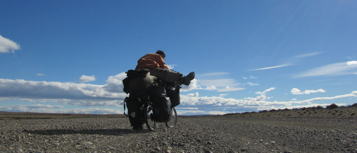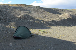 さて、風も強くなってきたこともあり、適当なところで、テントを張って休んでしまおうと思ったのだが、ここは何もないパンパ空間。え?何もないなら、その辺にテント張っちゃえばいいじゃんとお思いになるでしょう。ええ、いつものオイラならそうしています。が、ここは荒れ狂う強風が吹くパタゴニア。適当な場所にテントを張ってしまったら、風でテントが飛ばされてしまう恐れがあるのです。ということで、なんとか風除けになりそうなものがある場所を探す・・・も、ホントになにもない。しばらく走っていると、道路をならすためなのか、砂利が盛ってある場所を発見。大した風除けにはならなさそうなのだが、この先も何もない荒野が広がっているのを見ると、ここにテントを張るのがまだマシなような気がして、本日のテン場はここに決定。